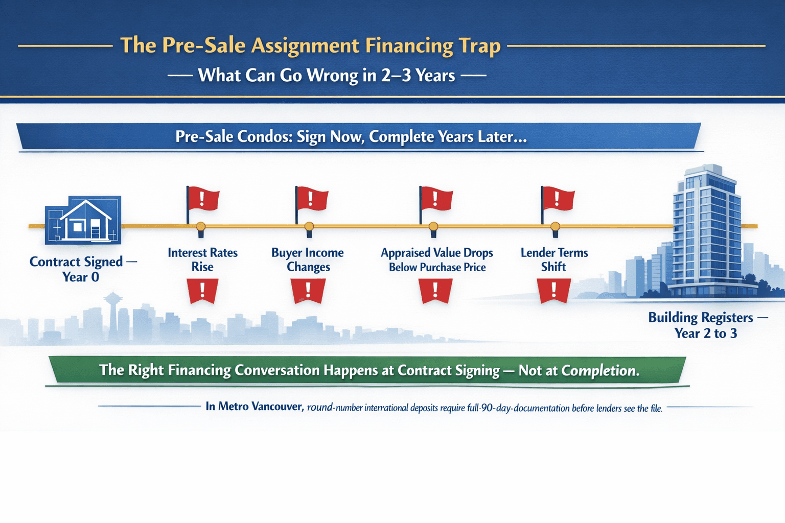 Vancouver and Surrey run on pre-sale condo contracts. Buyers sign purchase agreements 2-3years before a building is completed. By the time it registers, rates may have risen, income may have changed, and the appraised value may not match the original purchase price.