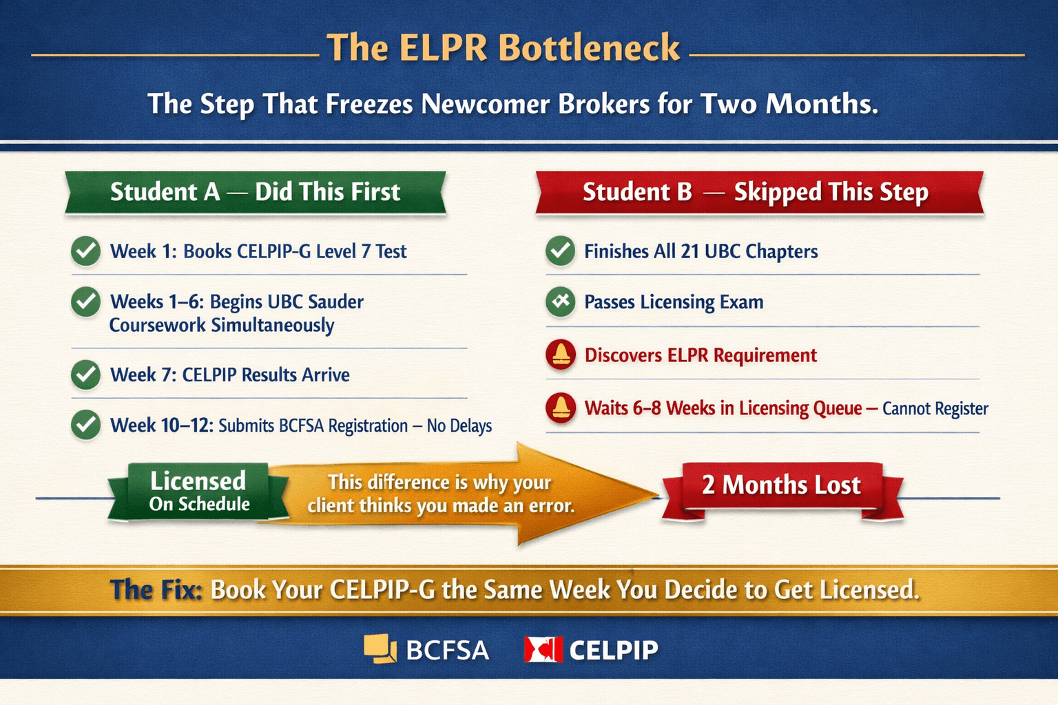 Students who finish all 21 UBC chapters and pass the exam without completing this first step end up frozen in a licensing queue for two months. The fix is simple: book your CELPIP-G the same week you decide to pursue licensing. Use the waiting period to begin your UBC coursework simultaneously.