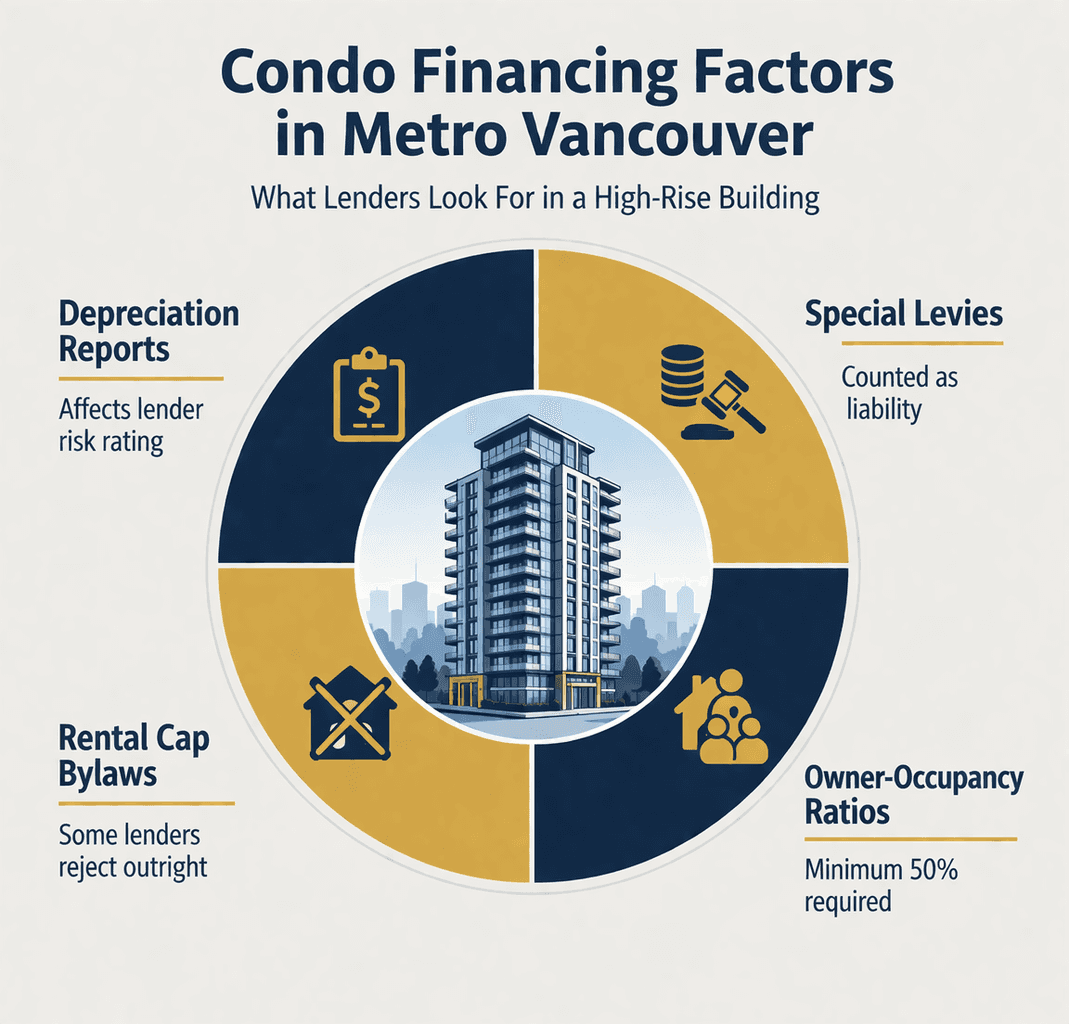 Depreciation reports, pending special levies, rental restriction bylaws, and minimum owner-occupancy ratios all affect whether a file gets approved. A $900,000 Surrey condo can fail financing not because of the buyer's income or credit, but because the strata corporation has a rental cap that the lender won't accept.