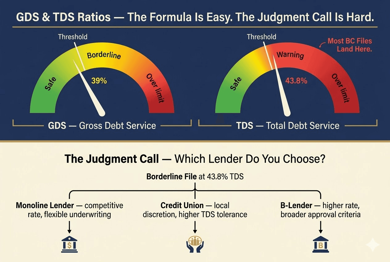 What nobody teaches is what to do when a client lands at 43.8% TDS — just under that ceiling. Do you go to a monoline lender, a credit union, or a B-lender? How do you present the file so it lands favourably?