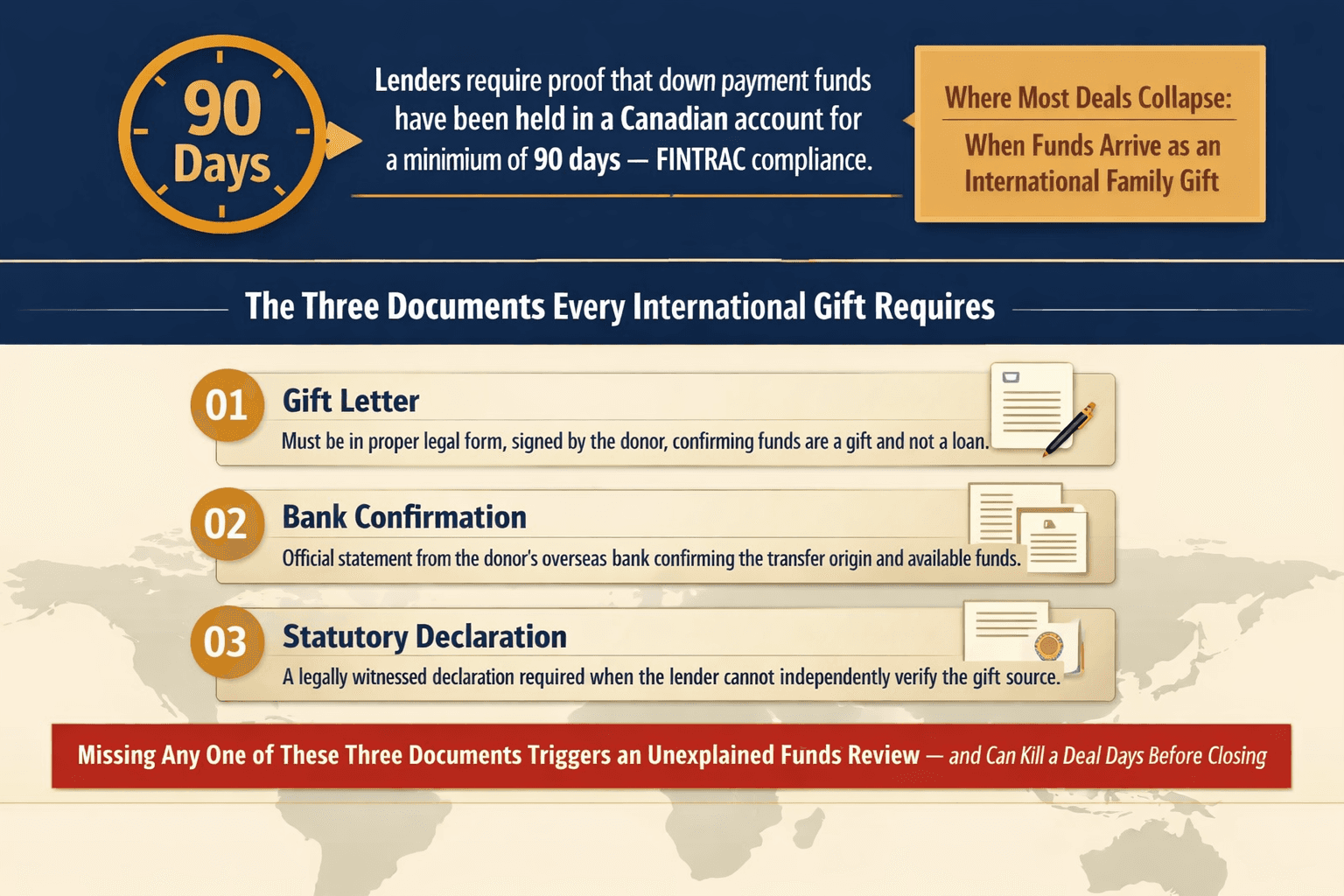 A $200,000 wire transfer from overseas requires three specific documents: a gift letter in legal form, bank confirmation from the sending party, and, in many cases, a statutory declaration. Missing any one of these triggers an unexplained funds review — and can kill a deal days before closing.