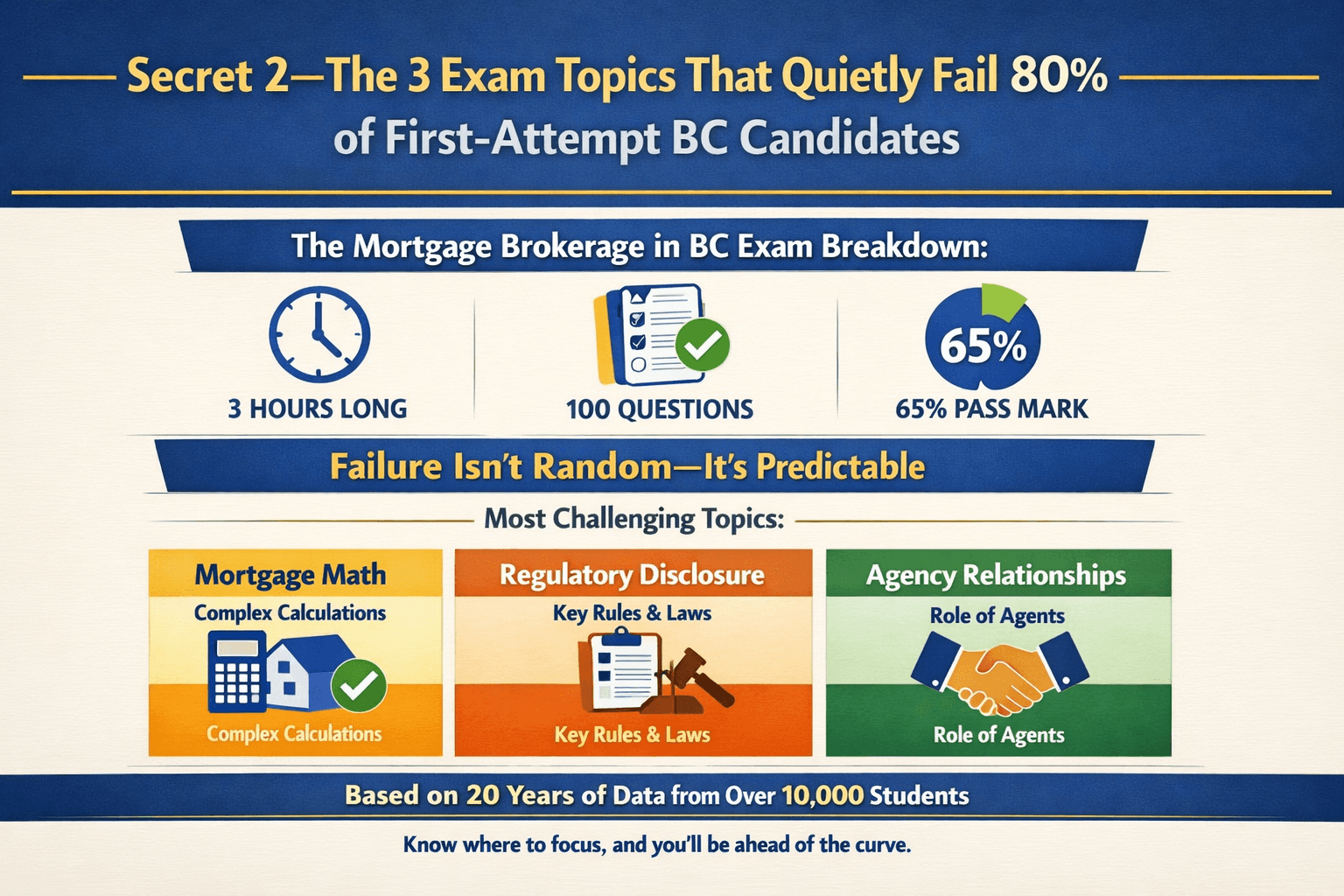 What most students don't realise is that not all 21 chapters carry equal exam weight. Failure isn't random —The Mortgage Brokerage in BC exam is three hours long, contains 100 multiple-choice questions, and requires a passing grade of 65%. UBC Sauder School of Business Knowing which of those 100 questions cluster around the same three topic areas changes how you prepare entirely.