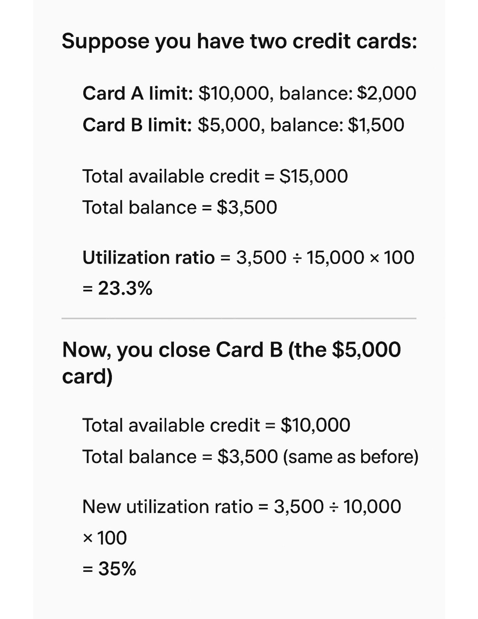 Your credit utilization ratio indicates your financial dependence on borrowed money. Keep your credit utilization ratio below 30%. For example, if you have a credit limit of $10,000, your balance should remain under $3,000.